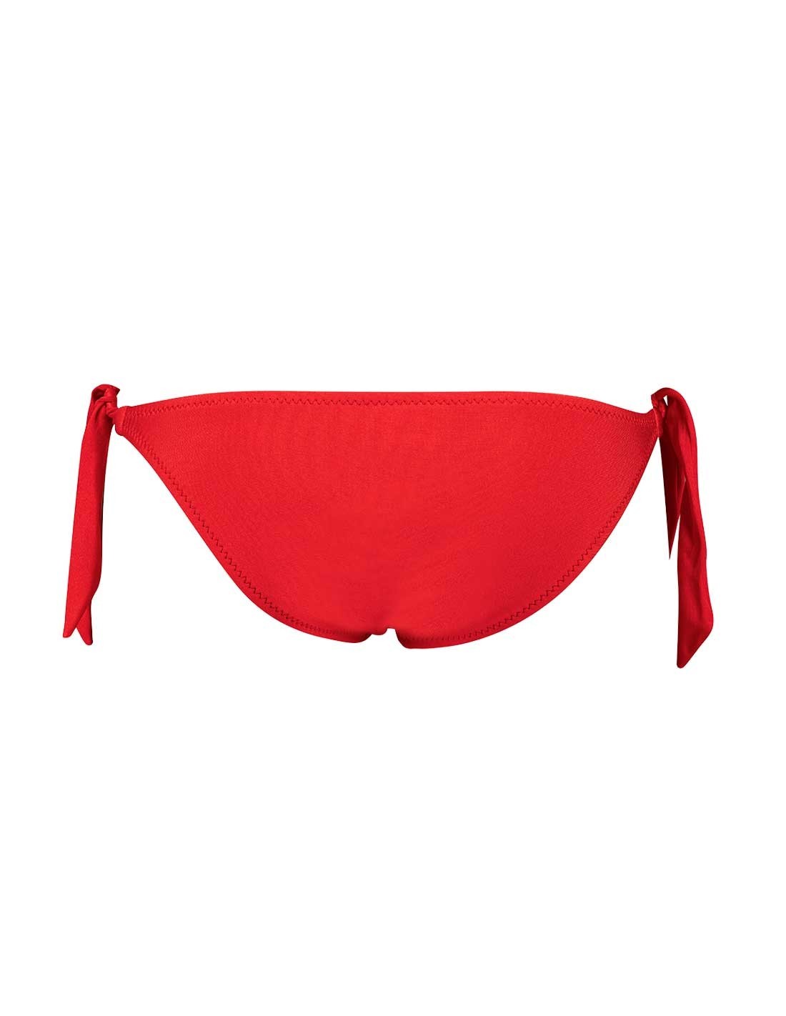 Bikini colore rosso, composto da fascia a balconcino push up, smerlato, modello Greta, con slip con fiocchi, modello Venere.
